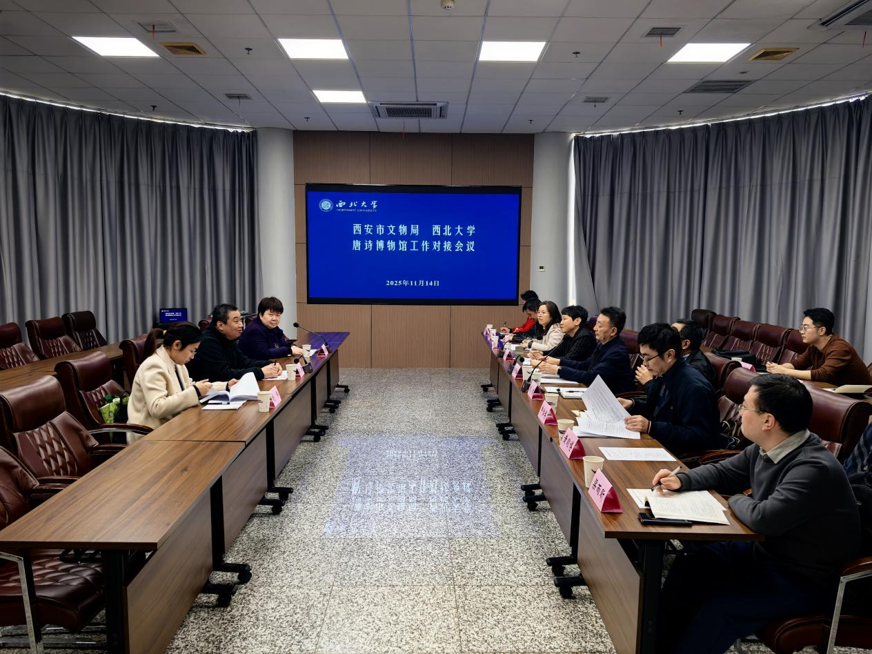 11月14日下午,西安市文物局党组成员、副局长冯健一行来德赢官网,就唐诗博物馆建设工作开展调研座谈。会议由校党委副书记赵作纽主持。市文物局博物馆与社会文物处处长刘夏盈和相关负责人,德赢官网博物馆、中国文化研究中心、社科处、国资处、图书馆负责人参加调研座谈。