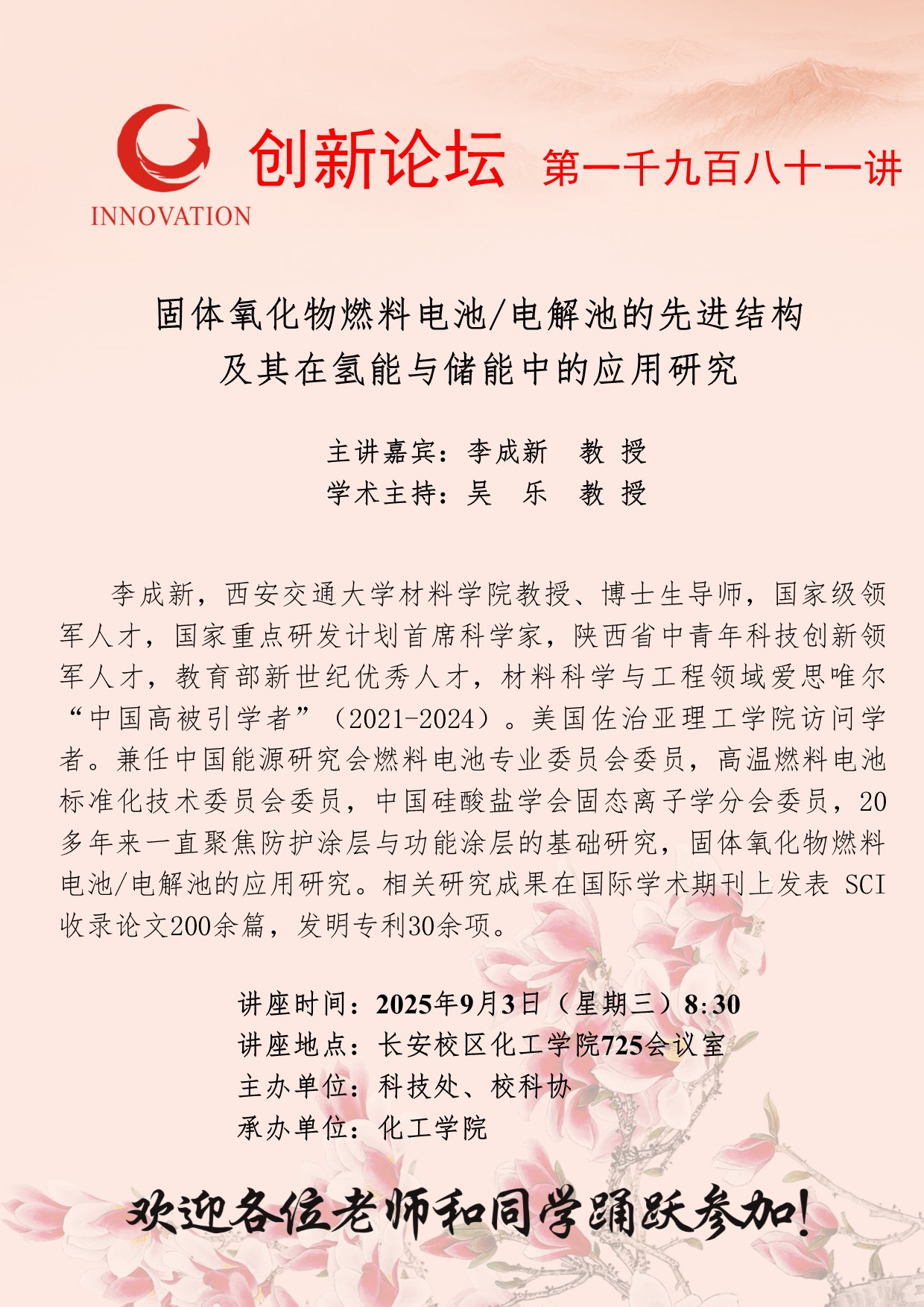 李成新 教授 德赢AC米兰官网创新论坛第一千九百八十一讲:固体氧化物燃料电池/电解池的先进结构及其在氢能与储能中的应用研究 讲座时间 2025年9月3日(星期三)8:30 讲座地点 长安校区化工学院725会议室 讲座人介绍 李成新 教授 讲座内容