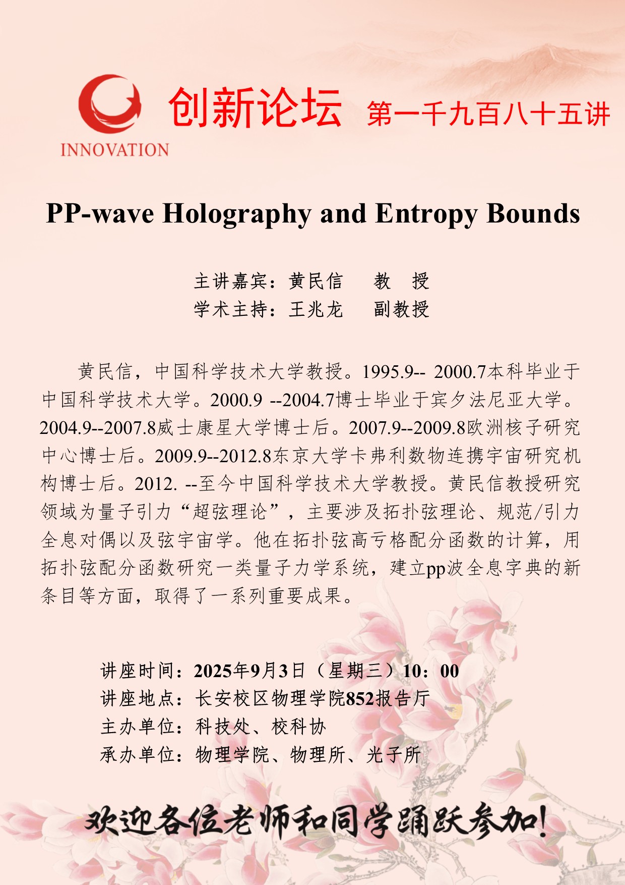 黄民信 教授 德赢AC米兰官网创新论坛第一千九百八十五讲:PP-wave Holography and Entropy Bounds 讲座时间 2025年9月3日(星期三)10:00 讲座地点 长安校区物理学院852报告厅 讲座人介绍 黄民信 教授 讲座内容