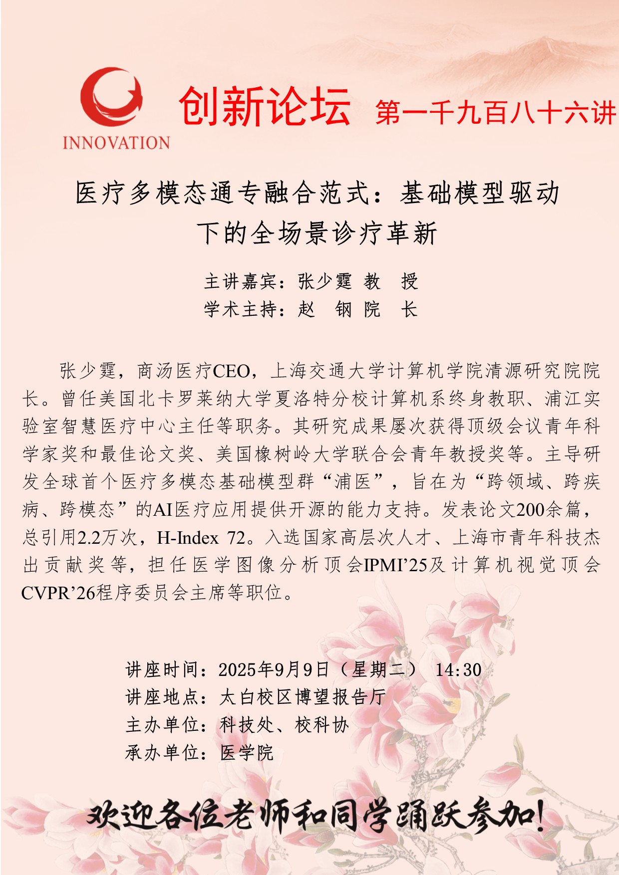 张少霆 教 授 德赢AC米兰官网创新论坛第一千九百八十六讲:医疗多模态通专融合范式:基础模型驱动下的全场景诊疗革新 讲座时间 2025年9月9日(星期二) 14:30 讲座地点 太白校区博望报告厅 讲座人介绍 张少霆 教 授 讲座内容 fu