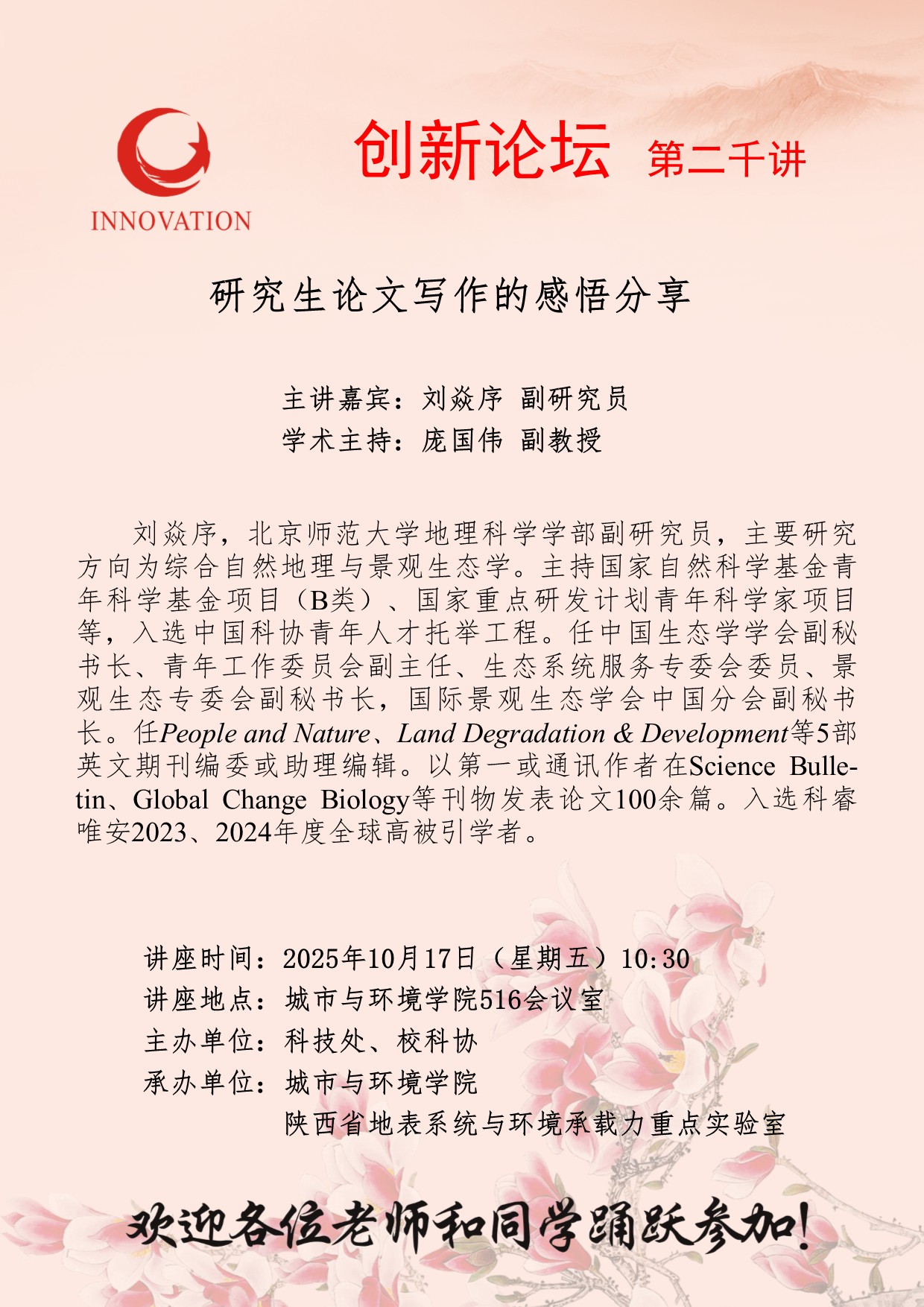 刘焱序 副研究员 德赢AC米兰官网创新论坛第二千讲:研究生论文写作的感悟分享 讲座时间 2025年10月17日(星期五)10:30 讲座地点 城市与环境学院516会议室 讲座人介绍 刘焱序 副研究员 讲座内容