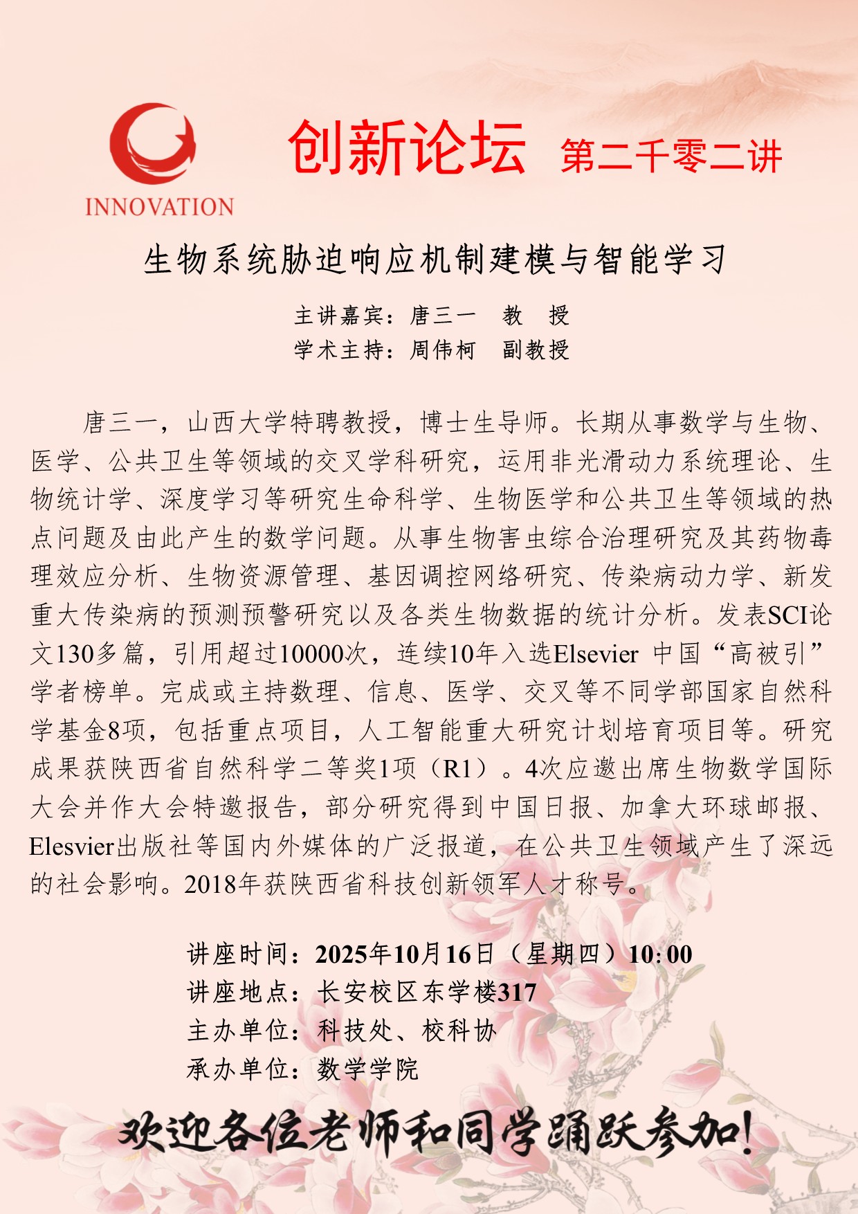 唐三一 教授 德赢AC米兰官网创新论坛第二千零二讲:生物系统胁迫响应机制建模与智能学习 讲座时间 2025年10月16日(星期四)10:00 讲座地点 长安校区东学楼317 讲座人介绍 唐三一 教授 讲座内容