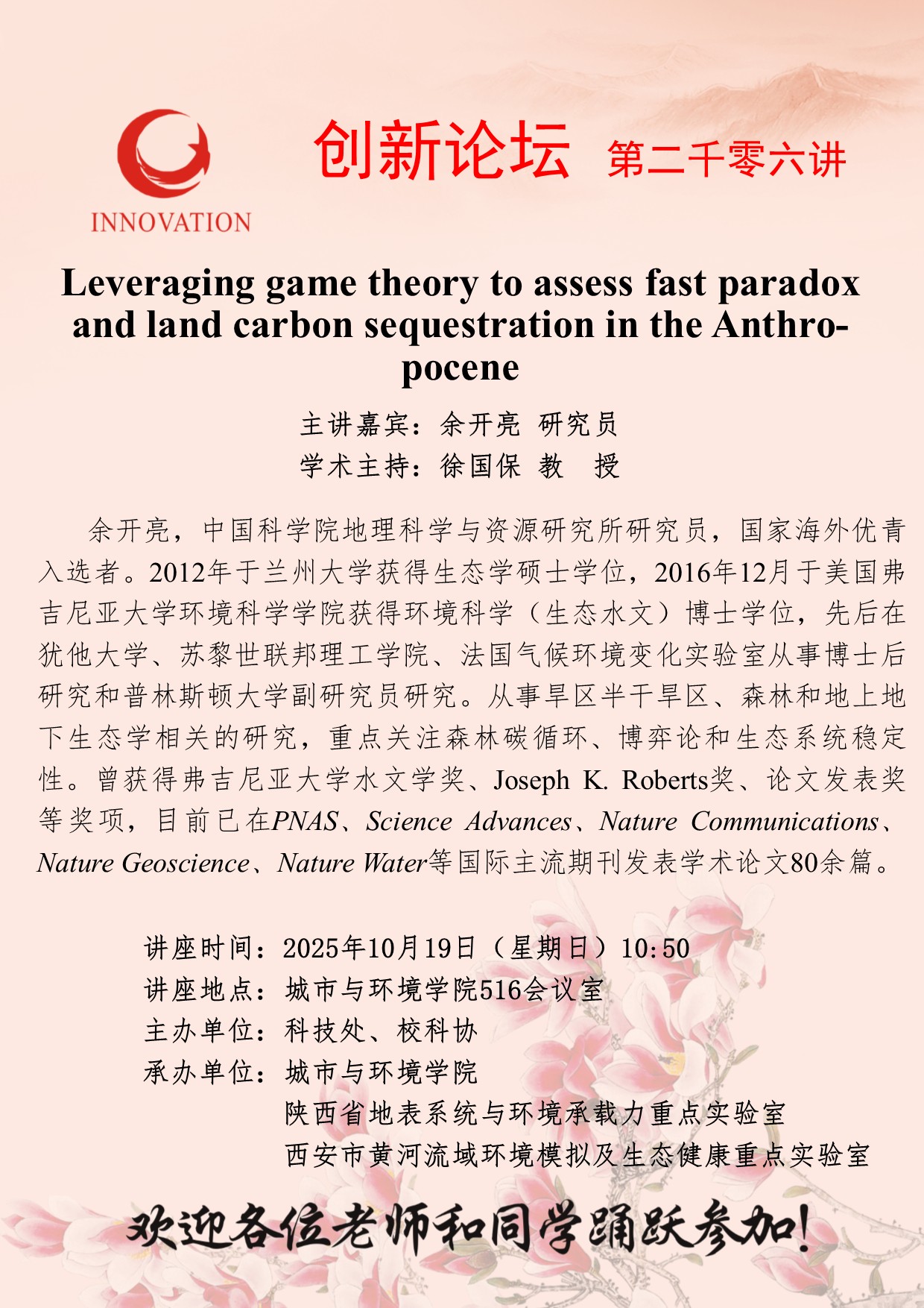 余开亮 研究员 德赢AC米兰官网创新论坛第二千零六讲:Leveraging game theory to assess fast paradoxand land carbon sequestration in the Anthro-pocene 讲座时间 2025年10月19日(星期日)10:50 讲座地点 城市与环境学院516会议室 讲座人介绍 余开亮 研究员 讲座内容