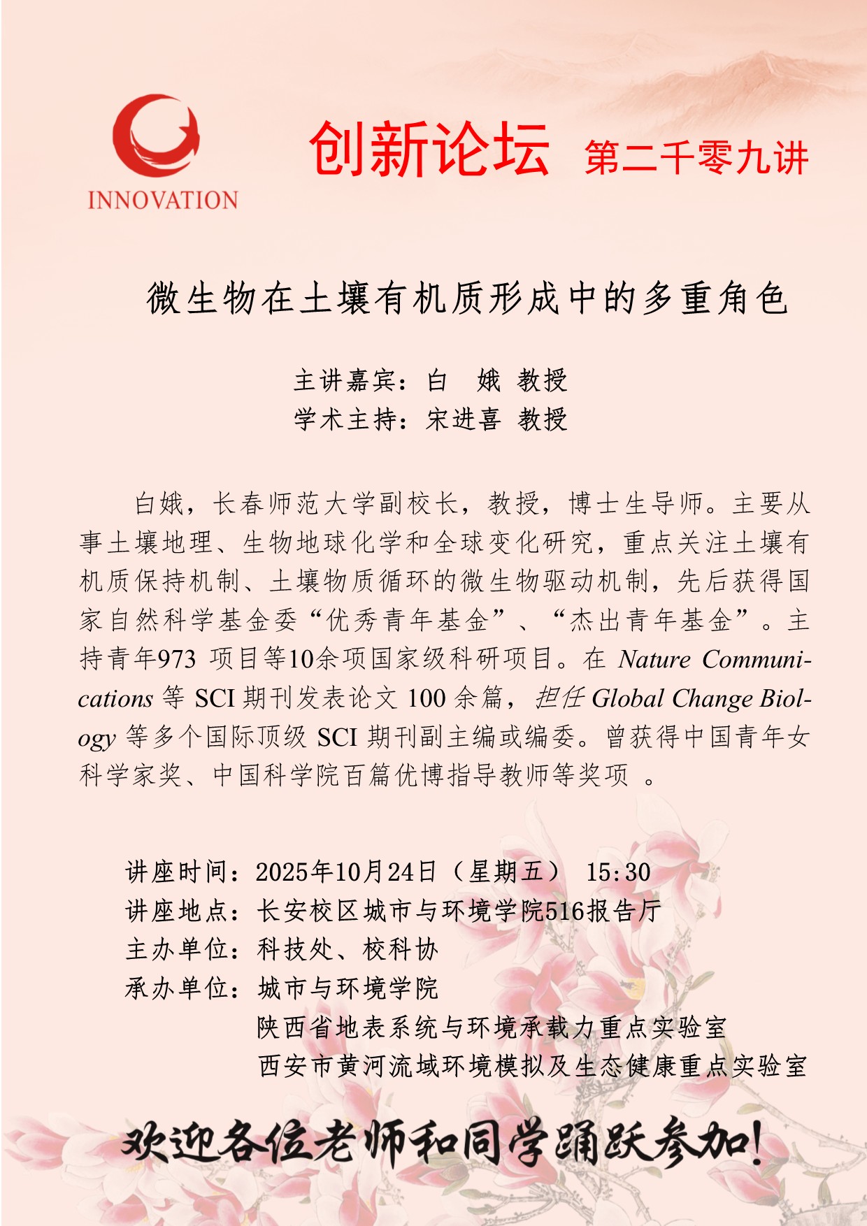 白娥 教授 德赢AC米兰官网创新论坛第二千零九讲:微生物在土壤有机质形成中的多重角色 讲座时间 2025年10月24日(星期五) 15:30 讲座地点 长安校区城市与环境学院516报告厅 讲座人介绍 白娥 教授 讲座内容