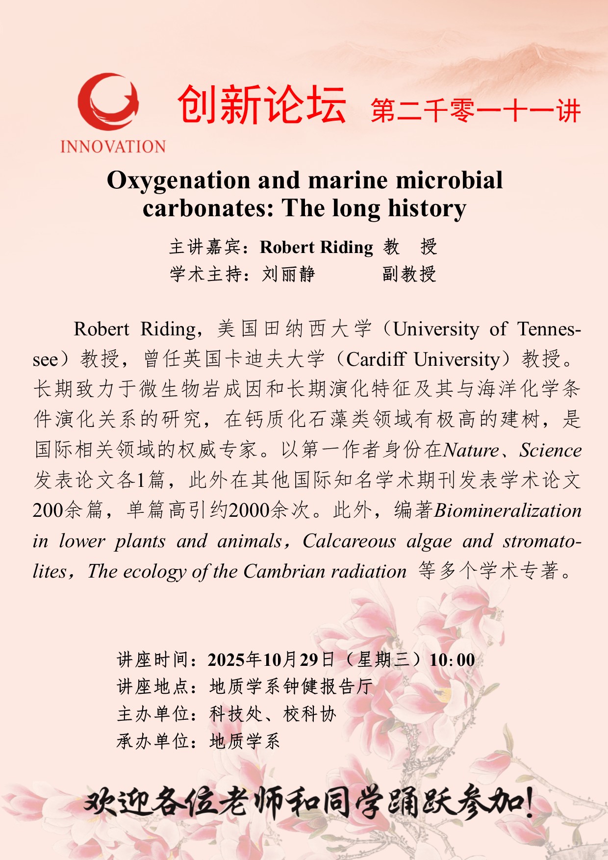 Robert Riding 教授 德赢AC米兰官网创新论坛第二千零一十一讲:Oxygenation and marine microbial carbonates: The long history 讲座时间 2025年10月29日(星期三)10:00 讲座地点 地质学系钟健报告厅 讲座人介绍 Robert Riding 教授 讲座内容