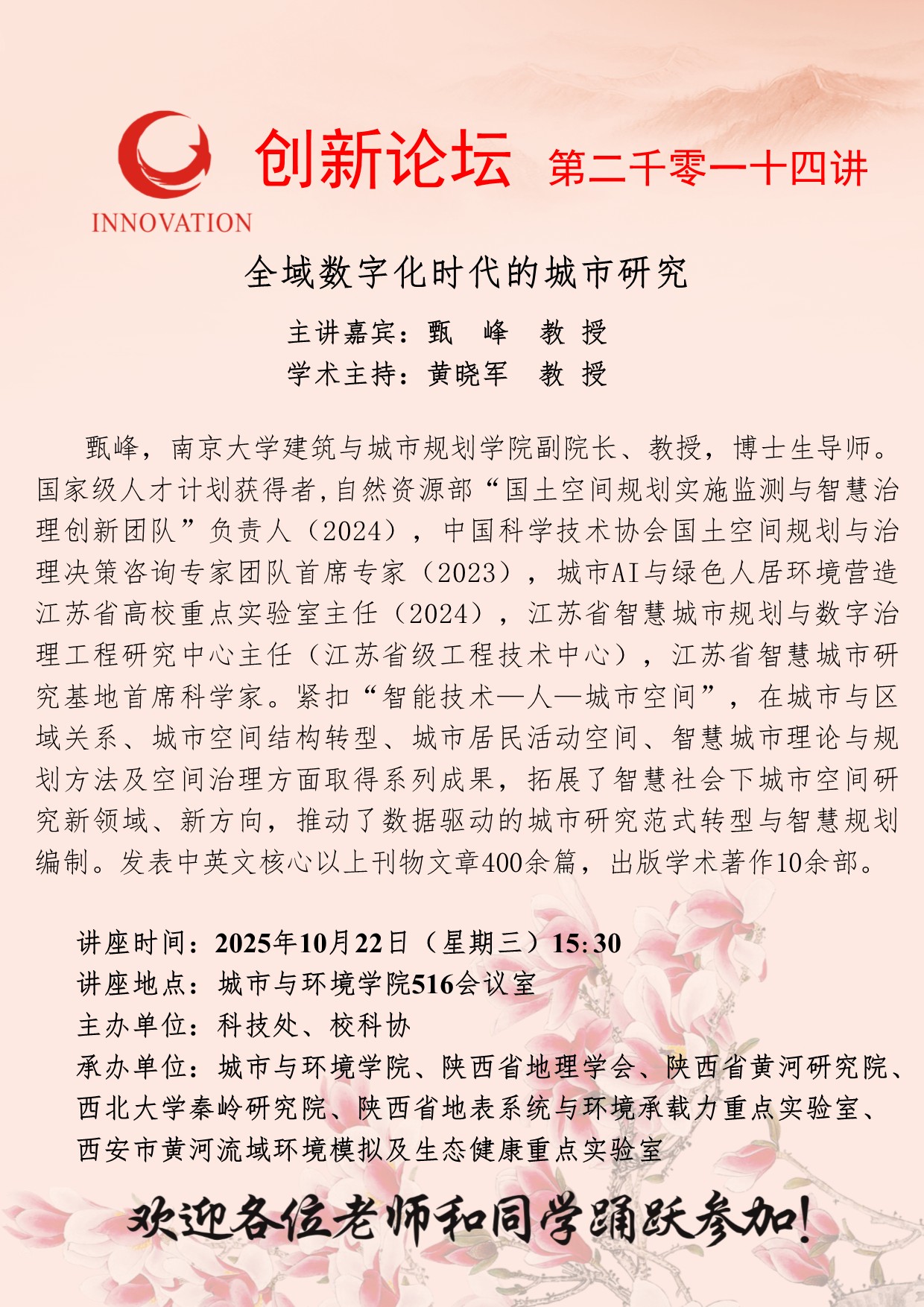 甄峰 教授 德赢AC米兰官网创新论坛第二千零一十四讲:全域数字化时代的城市研究 讲座时间 2025年10月22日(星期三)15:30 讲座地点 城市与环境学院516会议室 讲座人介绍 甄峰 教授 讲座内容