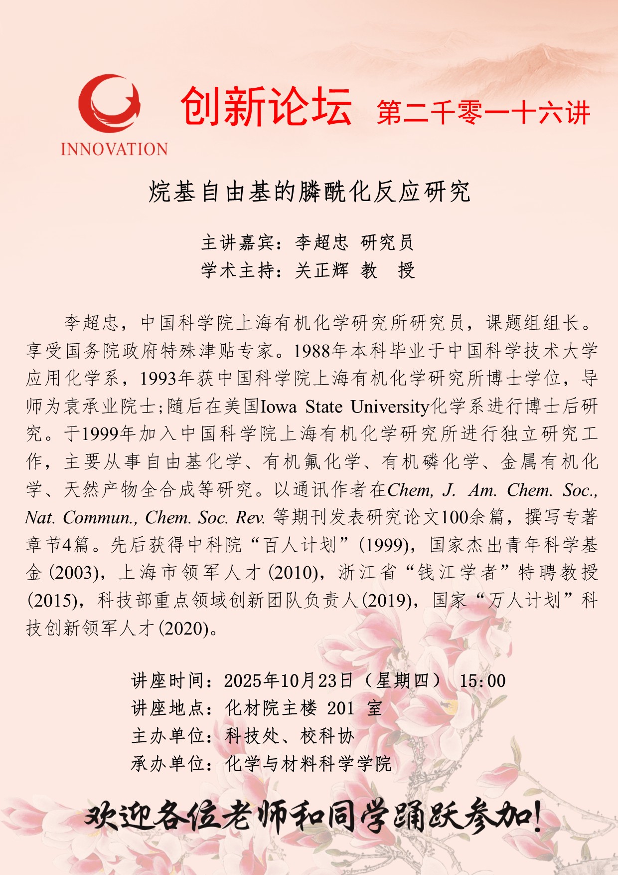 李超忠 研究员 德赢AC米兰官网创新论坛第二千零一十六讲:烷基自由基的膦酰化反应研究 讲座时间 2025年10月23日(星期四) 15:00 讲座地点 化材院主楼 201 室 讲座人介绍 李超忠 研究员 讲座内容