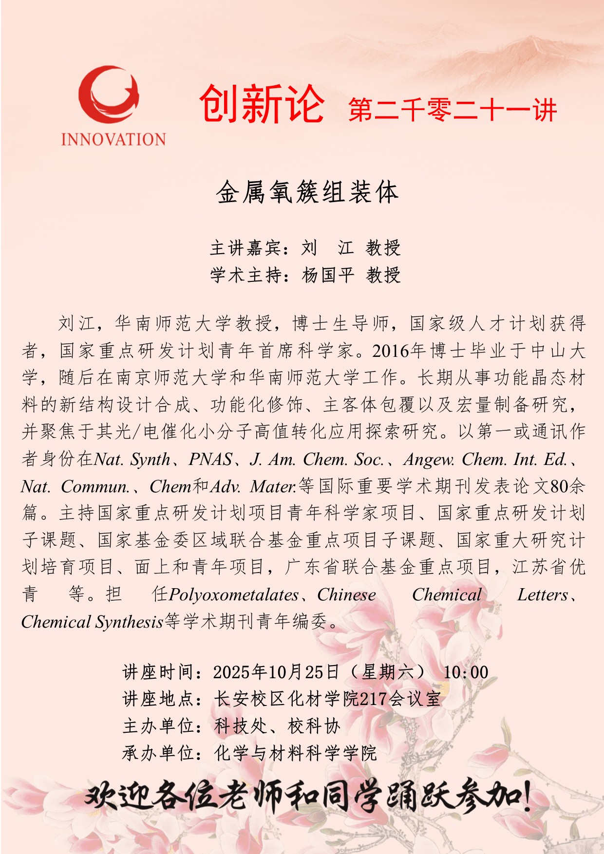 刘 江 教授 德赢AC米兰官网创新论坛第二千零二十一讲:金属氧簇组装体 讲座时间 2025年10月25日(星期六) 10:00 讲座地点 长安校区化材学院217会议室 讲座人介绍 刘 江 教授 讲座内容