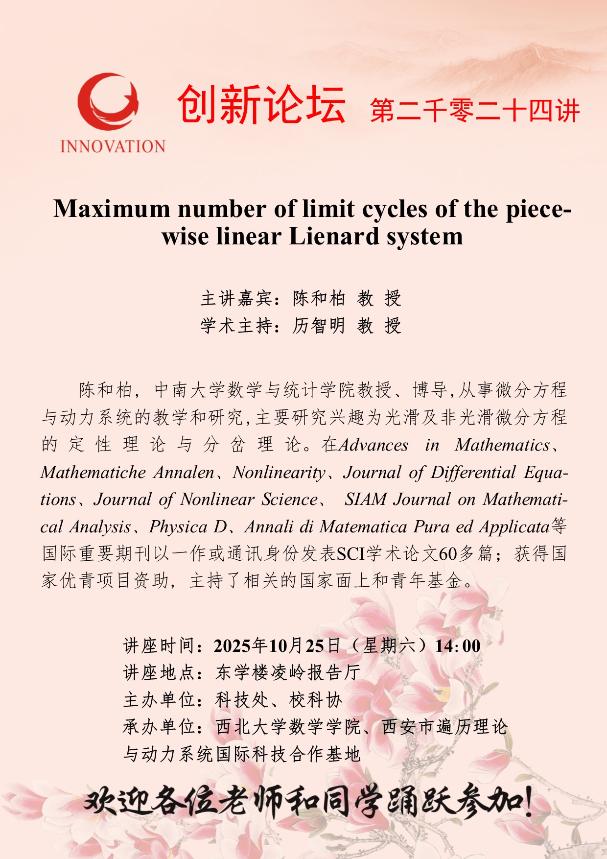 陈和柏 教 授 德赢AC米兰官网创新论坛第二千零二十四讲:Maximum number of limit cycles of the piecewise linear Lienard system 讲座时间 2025年10月25日(星期六)14:00 讲座地点 东学楼凌岭报告厅 讲座人介绍 陈和柏 教 授 讲座内容
