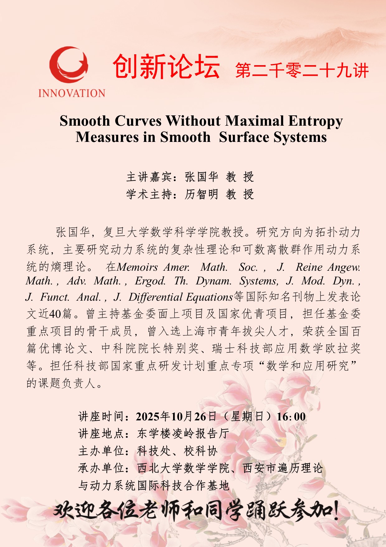 张国华 教 授 德赢AC米兰官网创新论坛第二千零二十九讲:Smooth Curves Without Maximal Entropy Measures in Smooth Surface Systems 讲座时间 2025年10月26日(星期日)16:00 讲座地点 东学楼凌岭报告厅 讲座人介绍 张国华 教 授 讲座内容
