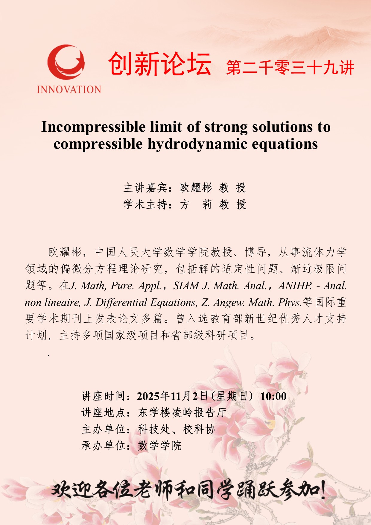 欧耀彬 教 授 德赢AC米兰官网创新论坛第二千零三十九讲:Incompressible limit of strong solutions to compressible hydrodynamic equations 讲座时间 2025年11月2日(星期日) 10:00 讲座地点 东学楼凌岭报告厅 讲座人介绍 欧耀彬 教 授 讲座内容
