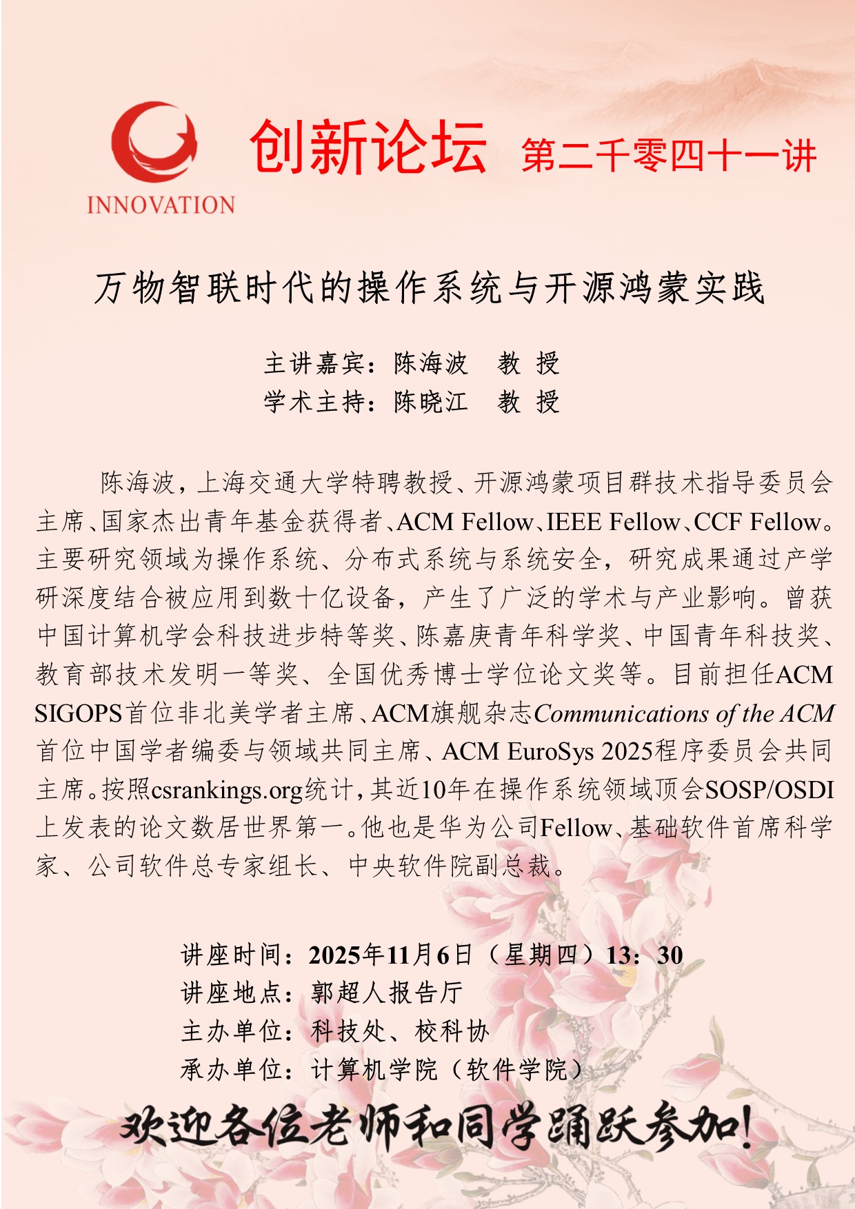 陈海波 教授 德赢AC米兰官网创新论坛第二千零四十一讲:万物智联时代的操作系统与开源鸿蒙实践 讲座时间 2025年11月6日(星期四)13:30 讲座地点 郭超人报告厅 讲座人介绍 陈海波 教授 讲座内容