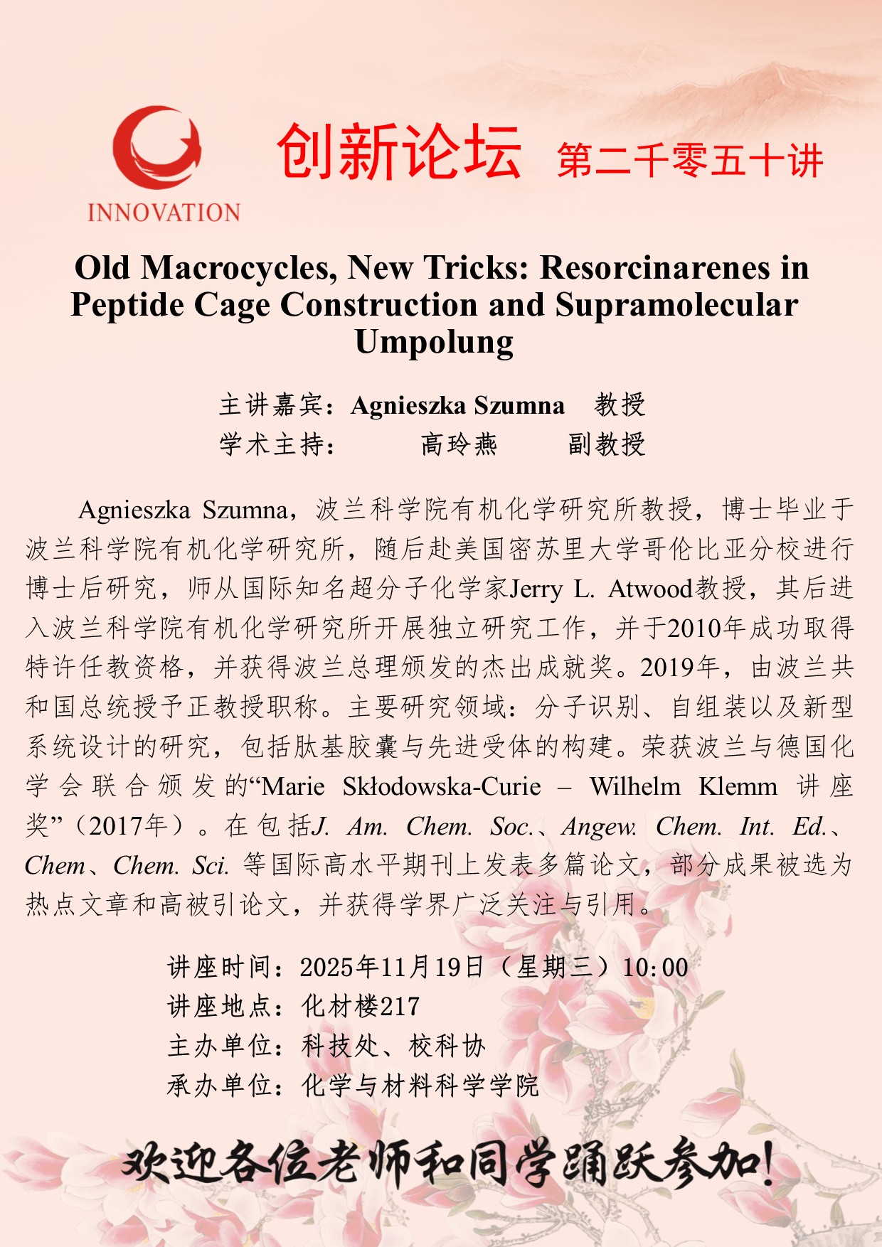 Agnieszka Szumna 教授 德赢AC米兰官网创新论坛第二千零五十讲:Old Macrocycles, New Tricks: Resorcinarenes in Peptide Cage Construction and Supramolecular Umpolung 讲座时间 2025年11月19日(星期三)10:00 讲座地点 化材楼217 讲座人介绍 Agnieszka Szumna 教授 讲座内容