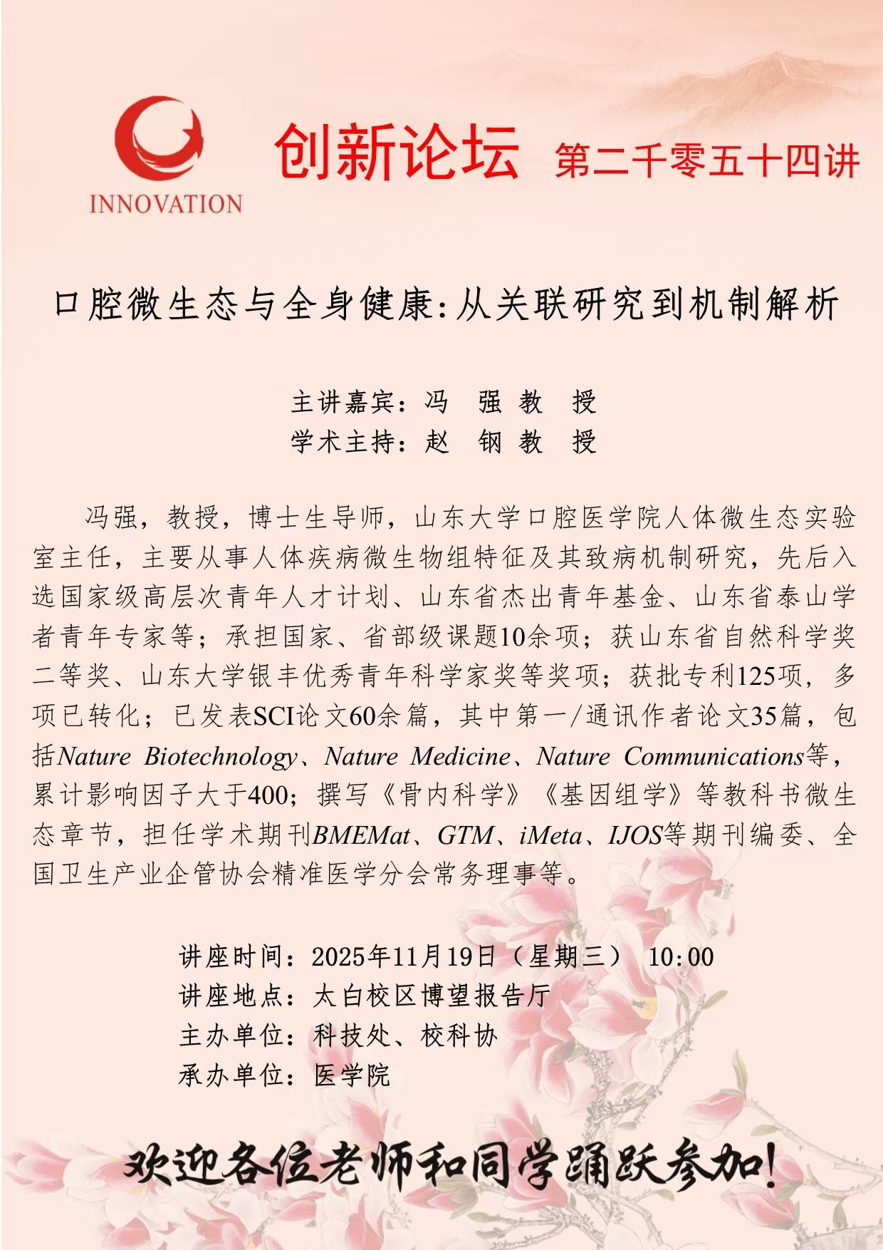 冯强 教授 德赢AC米兰官网创新论坛第二千零五十四讲:口腔微生态与全身健康:从关联研究到机制解析 讲座时间 2025年11月19日(星期三) 10:00 讲座地点 太白校区博望报告厅 讲座人介绍 冯强 教授 讲座内容