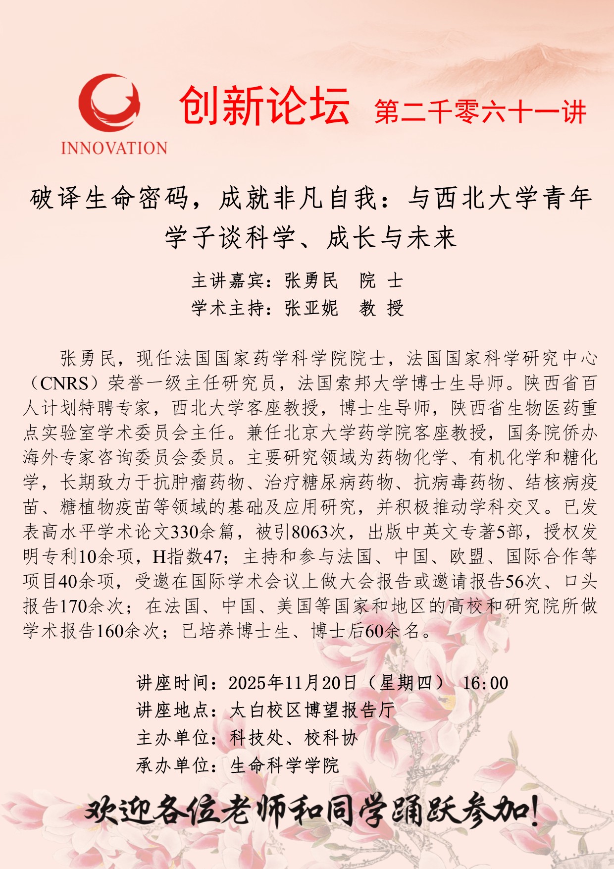 张勇民 院士 德赢AC米兰官网创新论坛第二千零六十一讲:破译生命密码,成就非凡自我:与德赢AC米兰官网青年学子谈科学、成长与未来 讲座时间 2025年11月20日(星期四) 16:00 讲座地点 太白校区博望报告厅 讲座人介绍 张勇民 院士 讲座内容