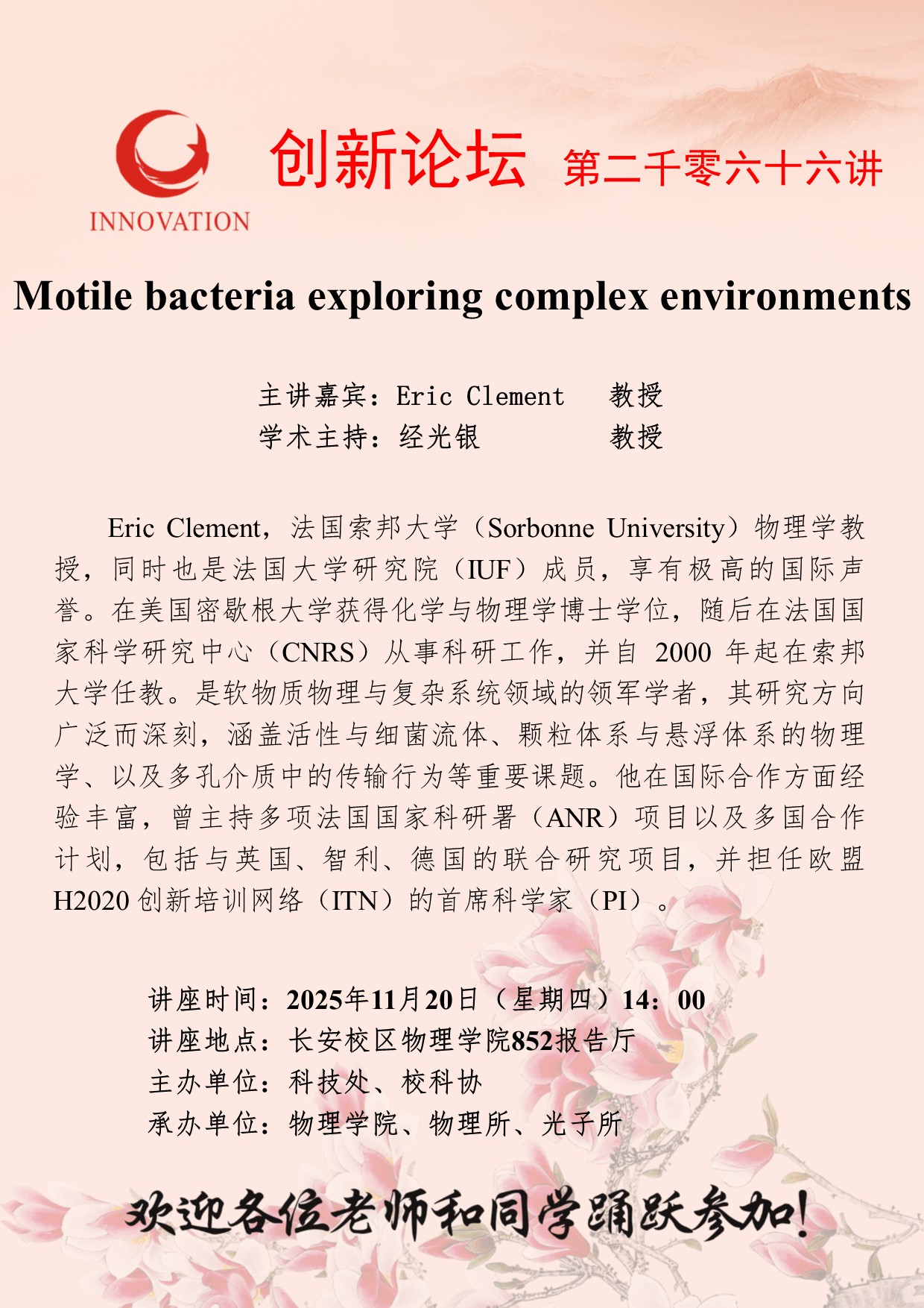 Eric Clement 教授 德赢AC米兰官网创新论坛第二千零六十六讲:Motile bacteria exploring complex environments 讲座时间 2025年11月20日(星期四)14:00 讲座地点 长安校区物理学院852报告厅 讲座人介绍 Eric Clement 教授 讲座内容