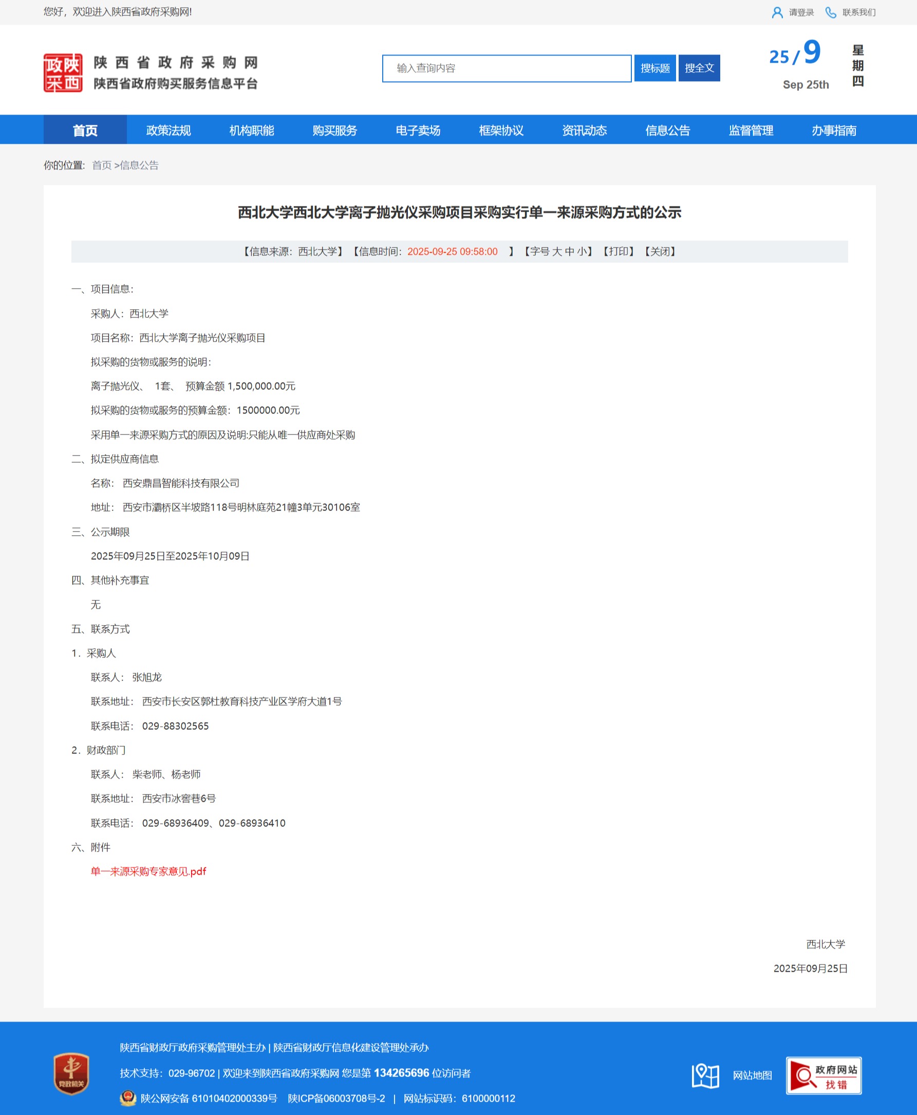 德赢AC米兰官网离子抛光仪采购项目实行单一来源采购方式的公示