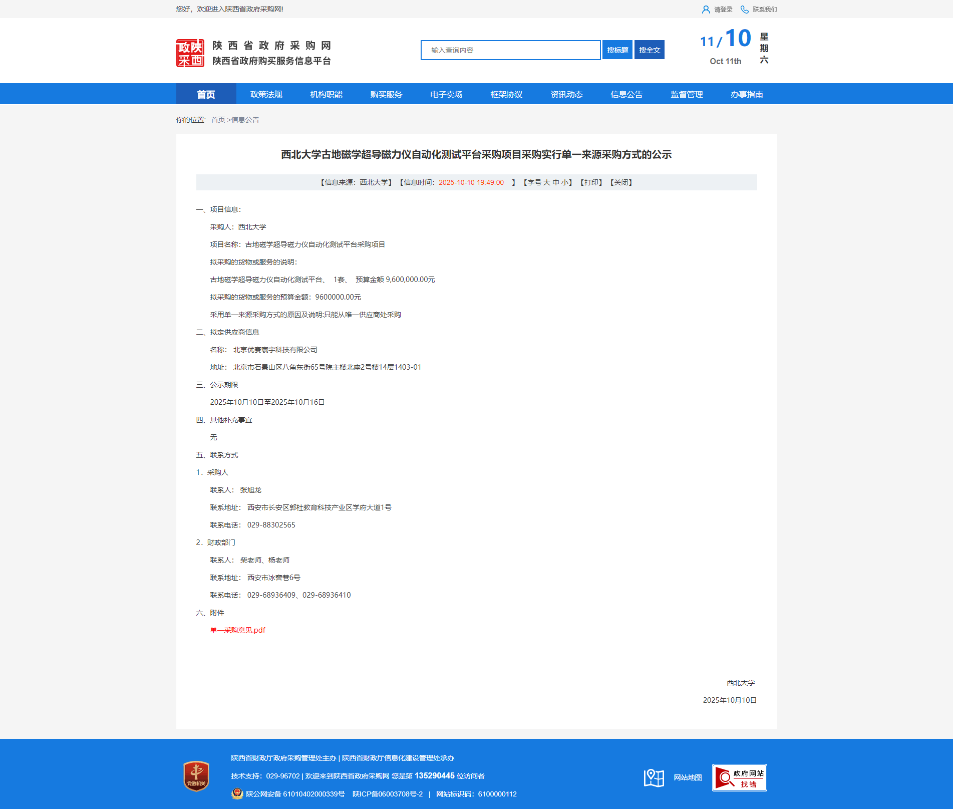 德赢AC米兰官网古地磁学超导磁力仪自动化测试平台采购项目采购实行单一来源采购方式的公示