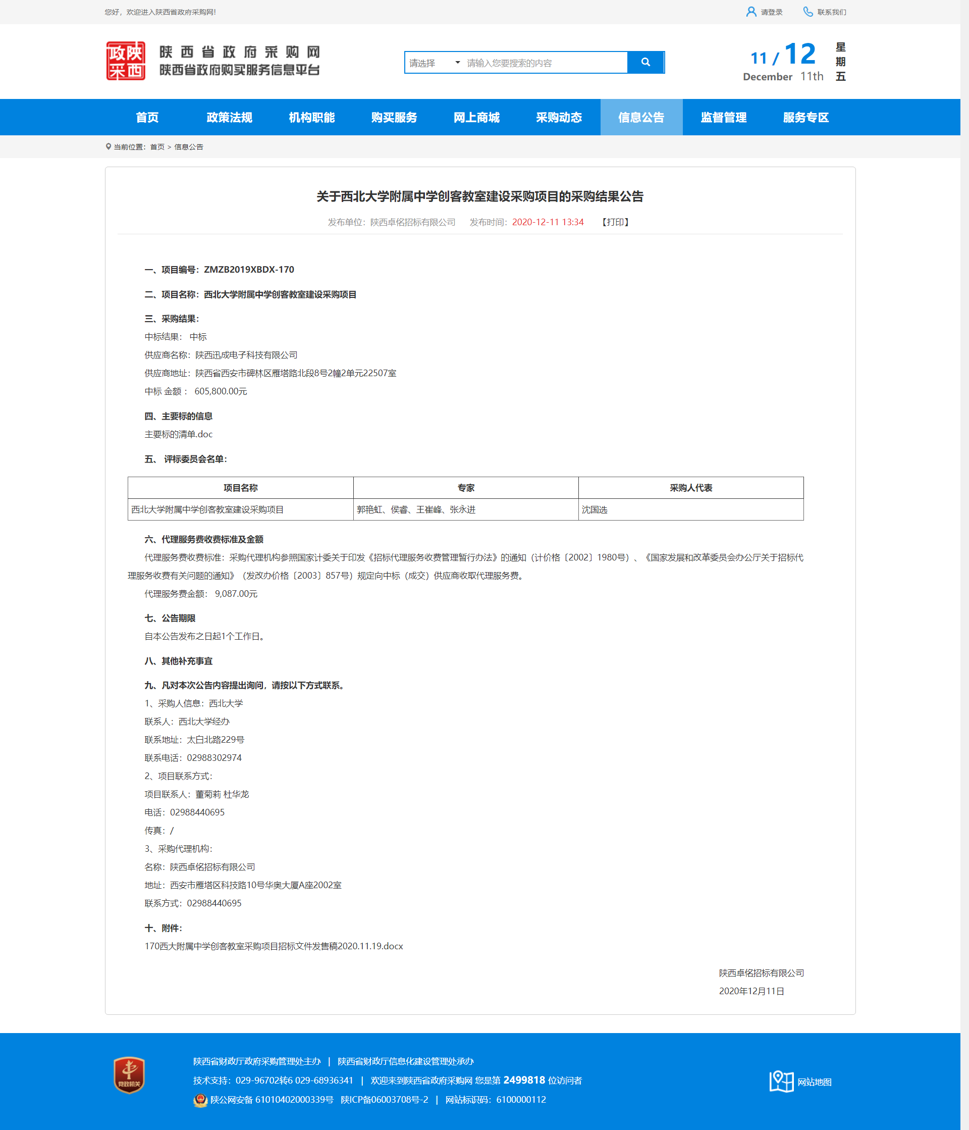 关于德赢AC米兰官网附属中学创客教室建设采购项目的采购结果公告 作者: 编辑:薛利娟 时间:2020-12-11 原公告地址:http://ccgp-shaanxi.gov.cn/notice/noticeDetail.do?noticeguid=8a85be3275d5d5c2017650494fb1060f
