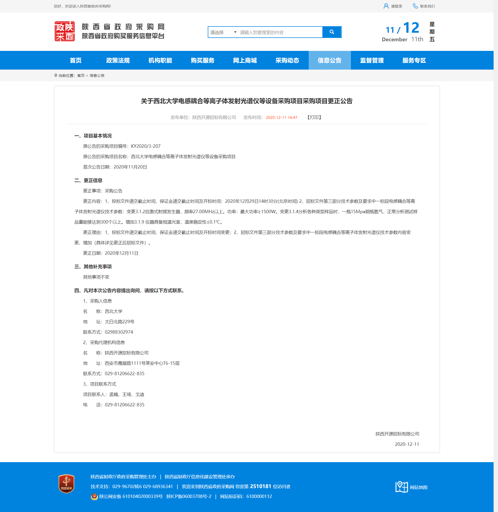 关于德赢AC米兰官网电感耦合等离子体发射光谱仪等设备采购项目采购项目更正公告 作者: 编辑:薛利娟 时间:2020-12-11 原公告地址:http://www.ccgp-shaanxi.gov.cn/notice/noticeDetail.do?noticeguid=8a85be3375d5d589017650e8e44672f0