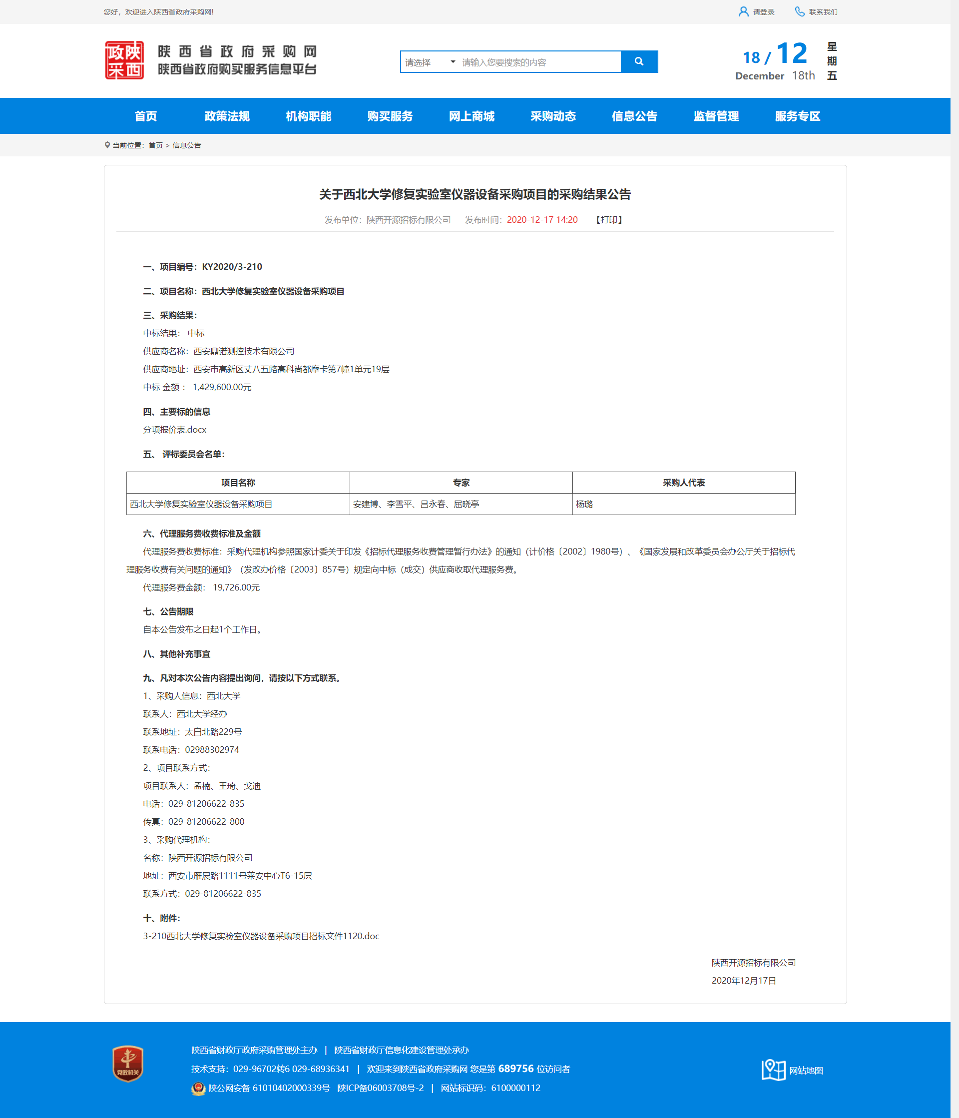 关于德赢AC米兰官网修复实验室仪器设备采购项目的采购结果公告 作者: 编辑:薛利娟 时间:2020-12-18 原公告地址:http://www.ccgp-shaanxi.gov.cn/notice/noticeDetail.do?noticeguid=8a85be34765f9eac01766f3cbcd749f6