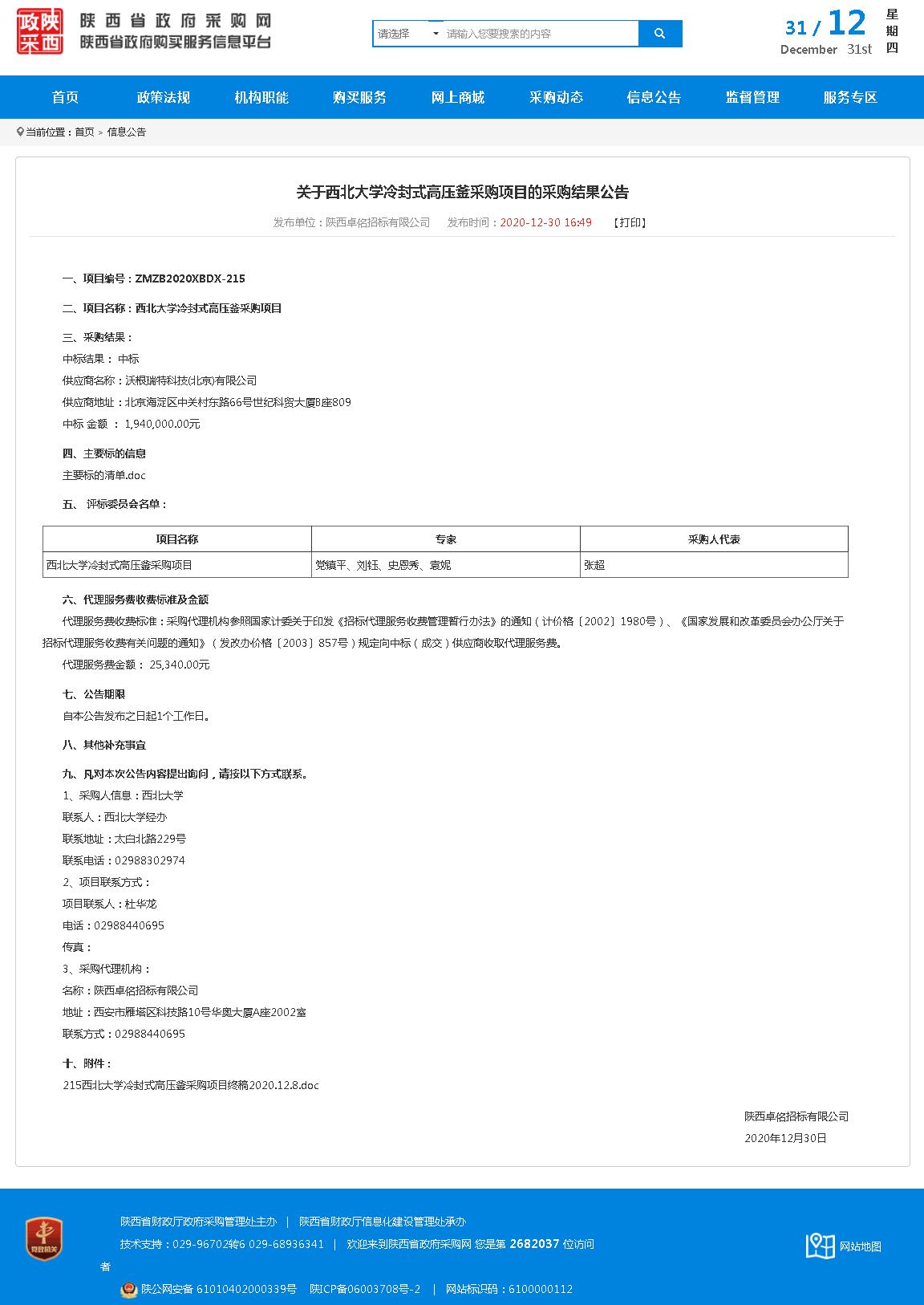 德赢AC米兰官网冷封式高压釜采购项目的采购结果公告