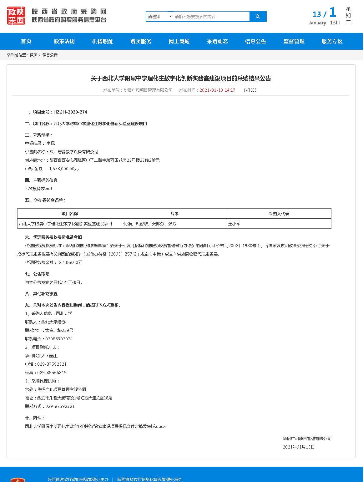 关于德赢AC米兰官网附属中学理化生数字化创新实验室建设项目的采购结果公告