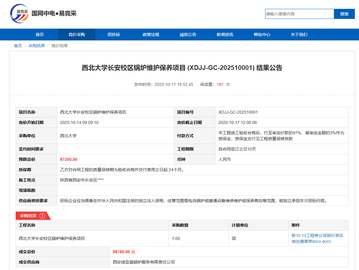 德赢AC米兰官网长安校区锅炉维护保养项目(XDJJ-GC-202510001)竞价结果公告
