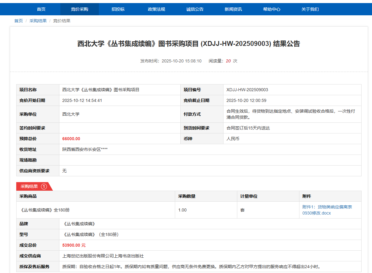 德赢AC米兰官网《丛书集成续编》图书采购项目(XDJJ-HW-202509003)竞价结果公告