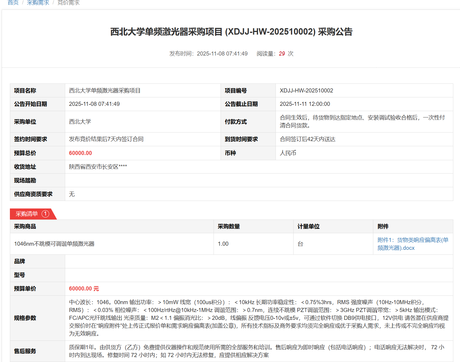德赢AC米兰官网单频激光器采购项目(XDJJ-HW-202510002)竞价采购公告