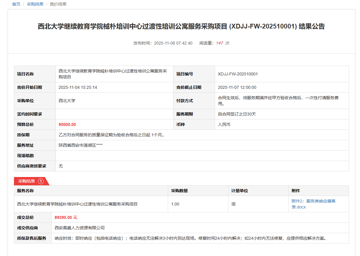 德赢AC米兰官网继续教育学院棫朴培训中心过渡性培训公寓服务采购项目(XDJJ-FW-202510001)竞价结果公告